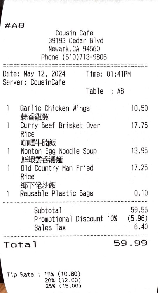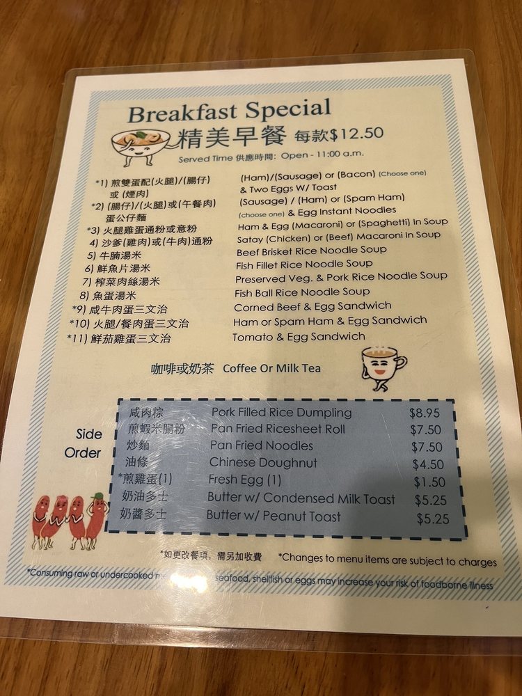 Introducing the menu at Cousin Cafe, a Hong Kong Style Cafe in Newark, CA, offers a variety of delicious dishes with a strong focus on comfort breakfast food and authentic Hong Kong flavors. Customers rave about the Hong Kong milk tea, fish porridge, Hainan chicken, fried rice, and crispy noodles. The generous portions and rich blends of flavors leave diners satisfied and coming back for more. The casual and inviting atmosphere, coupled with friendly service, make it a go-to spot for families and friends. With options for vegetarians, free Wi-Fi, and happy hour specials, Cousin Cafe caters to a diverse range of tastes and preferences. Consider stopping by for a hearty meal filled with classic Hong Kong comfort food.